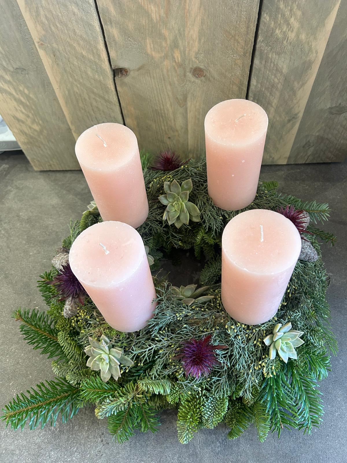 Der liebevoll von Hand gefertigte Adventskranz besteht aus frischem Tannengrün (Ø ca. 35 cm) und ist mit zarten Sukkulenten, lila Blütenakzenten und feinen Gräsern dekoriert. Vier rosafarbene Stumpenkerzen (Höhe ca. 14 cm) sorgen für ein warmes, sanftes Licht und bringen einen modernen, zugleich wohnlichen Look auf Ihren Tisch.